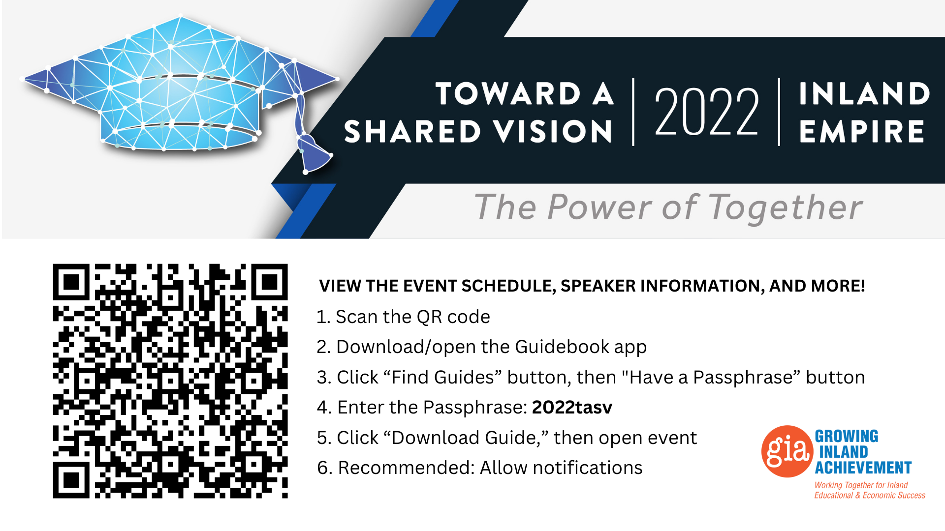GIA’s annual Toward a Shared Vision Summit will take place on October 25-26, 2023, at the Riverside Convention Center. The two-county regional event will unite Inland Empire leaders from K-12 and postsecondary education, business, government, and nonprofit sectors who share a vision for increasing equitable educational attainment, preparing a more qualified workforce, and fueling a thriving regional economy. Event participants will work together in sessions, workshops, and team breakouts to discuss collaborative strategies and solutions to accelerate equitable educational opportunities and pathways for student success.